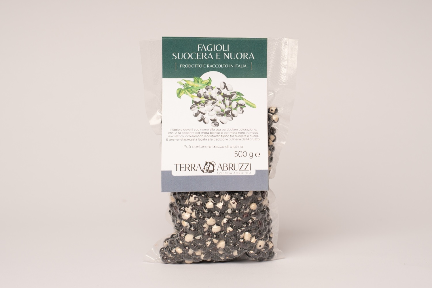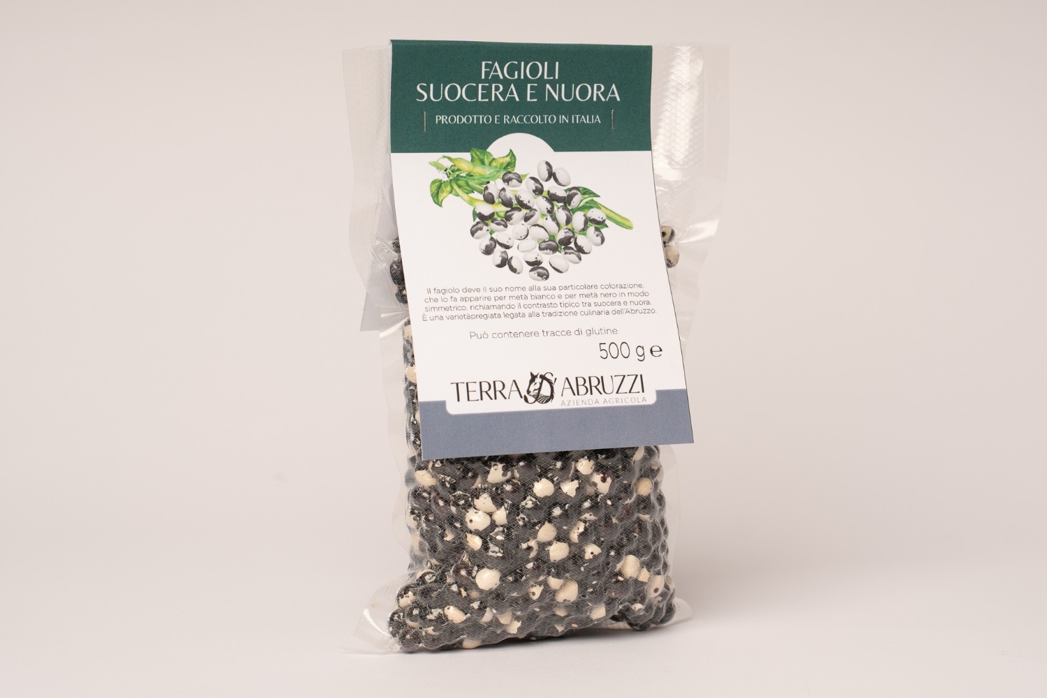 Fagioli secchi Suocera e Nuora, varietà autoctona della Majella, coltivati naturalmente a Vittorito (AQ) senza concimi né trattamenti. Ricchi di sapore e tradizione. Confezione da 500 g.